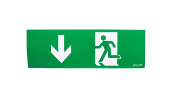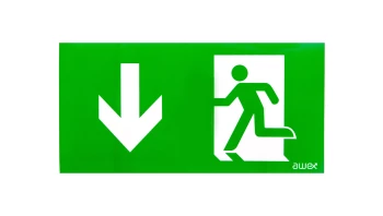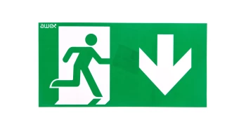 Piktogram PM26 100x300 strzałka dół człowiek w drzwiach logo awex (ISO7010)