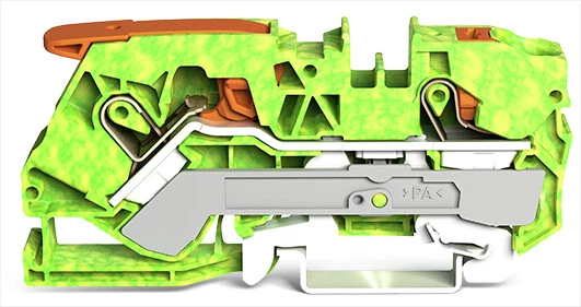 złączka PE 2-przewodowa; z dźwignią i przyciskami; 10 mm²; z otworem pomiarowym; opis z boku i na środku; na szynę TS 35 x 15 i 35 x 7,5; Push-in CAGE CLAMP®; 10,00 mm²; żółto-zielony