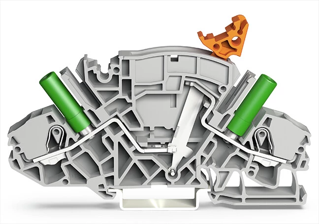 złączka rozłączalno-pomiarowa 2-przewodowa; np. do przekładników prądowych; z miejscem na mostek do zwierania łączników uchylnych; do wtyku pomiarowego Ø 4 mm; na szynę TS 35 x 15 i 35 x 7,5; 6 mm²; Push-in CAGE CLAMP®; 6,00 mm²; szary