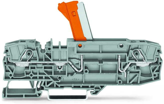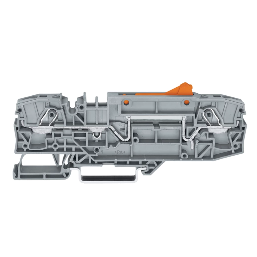 złączka rozłączalno-pomiarowa 2-przewodowa; z uchylnym łącznikiem nożowym; z możliwością pomiaru; uchwyt łącznika nożowego pomarańczowy; na szynę TS 35 x 15 i 35 x 7,5; 6 mm²; Push-in CAGE CLAMP®; 6,00 mm²; szary