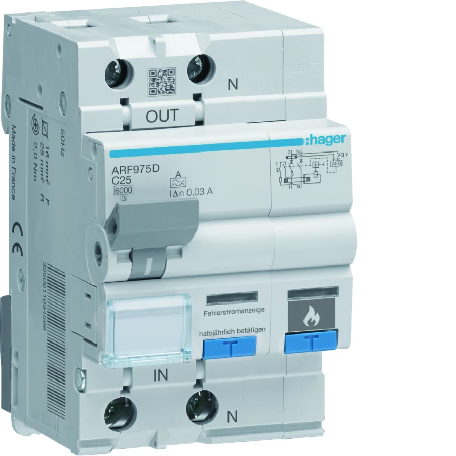 Detektor iskrzeń z członem nadprądowym i różnicowoprądowym 1P+N 6kA C 25A o numerze katalogowym ARF975D w kategorii Pozostałe, Niesklasyfikowane. Produkt wyprodukowany przez markę HAGER, seria AFDD.