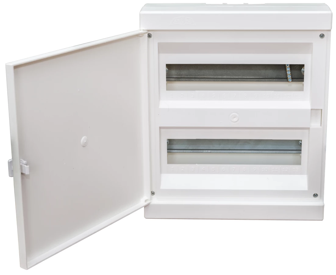 Rozdzielnica plastikowa ALFA 26 (2x13) białe drzwi o numerze katalogowym 5-000ALFA 26 BD w kategorii Tworzywowe natynkowe, Rozdzielnice i obudowy. Produkt wyprodukowany przez markę SABAJ, seria ALFA-SYSTEM.