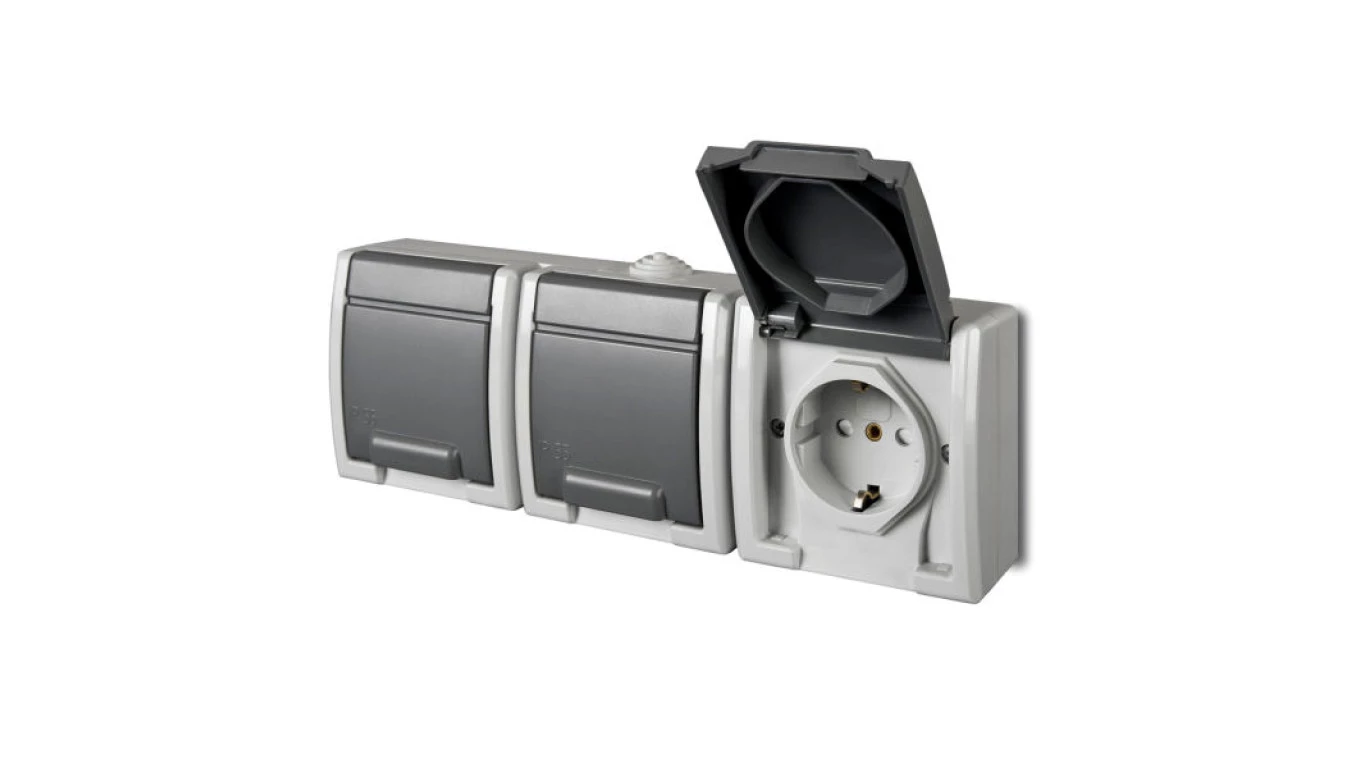 AQUANT SZARY GNIAZDO NT 3X SCHUKO Z KLAPKĄ IP55 ZACISKI ŚRUBOWE 16A 250V