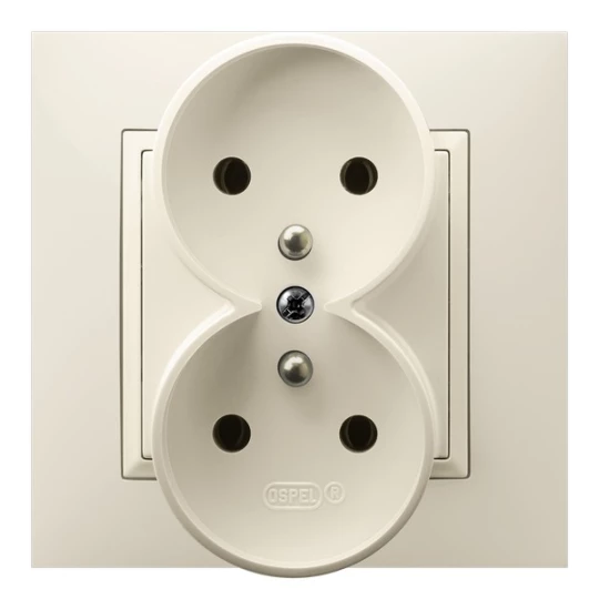 Gniazdo podwójne z uziemieniem z przesłonami torów prądowych, kompletne z ramką, ecru ARIA o numerze katalogowym GP-2UZP/27 w kategorii Gniazda podtynkowe, Gniazda instalacyjne. Produkt wyprodukowany przez markę OSPEL, seria ARIA.