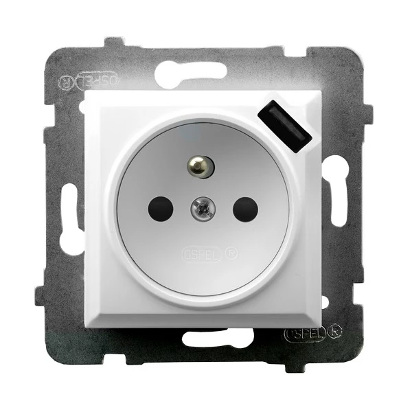 Gniazdo pojedyncze z uziemieniem z przesłonami torów prądowych, z ładowarką USB, biały ARIA o numerze katalogowym GP-1UZPUSB/M/00 w kategorii Gniazda podtynkowe, Gniazda instalacyjne. Produkt wyprodukowany przez markę OSPEL, seria ARIA.