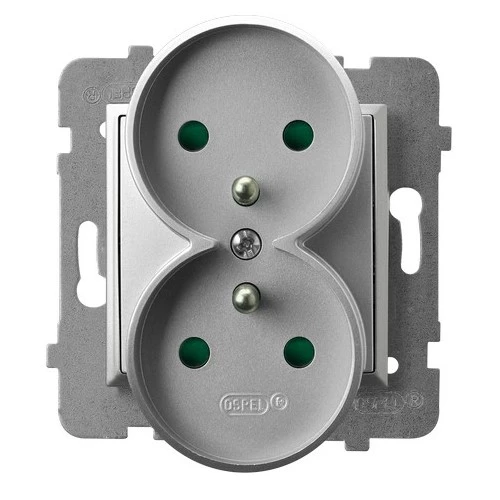 Gniazdo podwójne z uziemieniem z przesłonami torów prądowych, moduł bez ramki, srebro ARIA o numerze katalogowym GP-2URZP/M/18 w kategorii Gniazda podtynkowe, Gniazda instalacyjne. Produkt wyprodukowany przez markę OSPEL, seria ARIA.