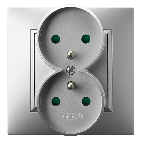 Gniazdo podwójne z uziemieniem z przesłonami torów prądowych, kompletne z ramką, srebro ARIA o numerze katalogowym GP-2UZP/18 w kategorii Gniazda podtynkowe, Gniazda instalacyjne. Produkt wyprodukowany przez markę OSPEL, seria ARIA.