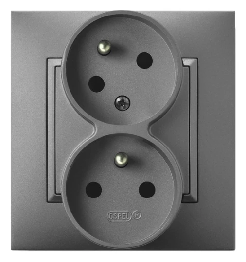 Gniazdo podwójne z uziemieniem z funkcją niezamienności faz, kompletne z ramką, szary mat ARIA o numerze katalogowym GP-2UC/70 w kategorii Gniazda podtynkowe, Gniazda instalacyjne. Produkt wyprodukowany przez markę OSPEL, seria ARIA.