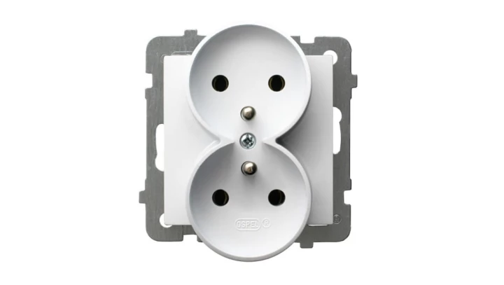 Gniazdo podwójne z uziemieniem, do montażu w ramki z przesłonami torów prądowych, biały, AS o numerze katalogowym GP-2GRZP/M/00 w kategorii Gniazda podtynkowe, Gniazda instalacyjne. Produkt wyprodukowany przez markę OSPEL, seria AS.