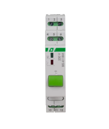 Przekaźnik bistabilny BIS-411BM z przyciskiem do sterowania ręcznego i z pamięcią, montaż na szynie DIN, 230V o numerze katalogowym BIS-411BM w kategorii Przekaźniki impulsowe, Przekaźniki. Produkt wyprodukowany przez markę F&F.