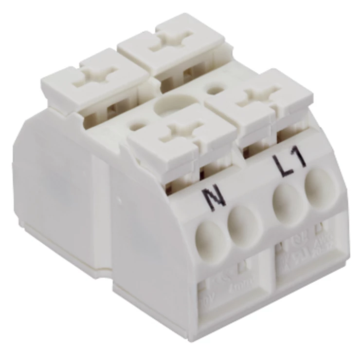 blok zasilający 4-przewodowy; bez styku PE; N-L1; 2-bieg.; do wkrętu samogwintującego Ø 2,9 mm od dołu; z 2x pin; 4 mm²; biały