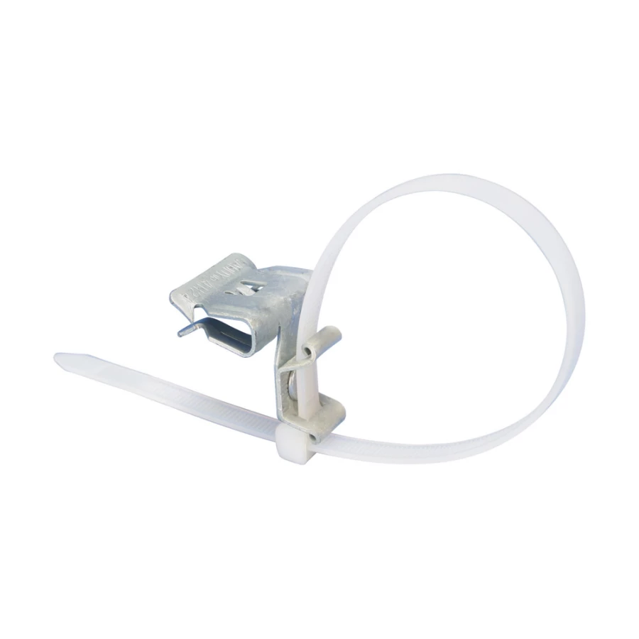 CABLE TIE HOLDER WITH FLANGE CLIP, SPRING STEEL, CADDY ARMOUR, 8–14 MM FLANGE, NYLON WHITE TIE, 10–7