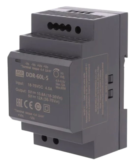 Przetwornica 60W 18~75V-5V 12A o numerze katalogowym DDR-60L-5 w kategorii Przetwornice AC/DC i DC/DC, Zasilacze. Produkt wyprodukowany przez markę MEAN WELL, seria DDR.
