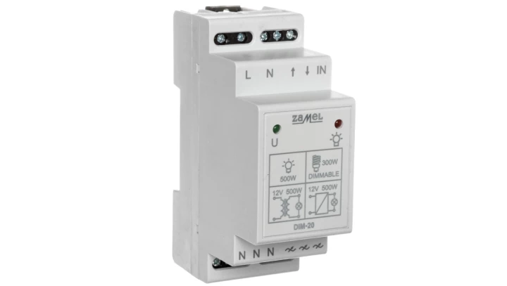 Ściemniacz 230V AC 40-500W Typ: DIM-20 o numerze katalogowym EXT10000022 w kategorii Regulatory, Aparatura sterująca. Produkt wyprodukowany przez markę ZAMEL, seria EXTA.