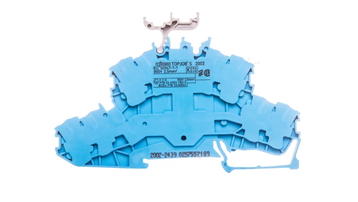 złączka 2-piętrowa 4-przewodowa; złączka przelotowa 8-przewodowa; N; z podstawką oznacznika; do zastosowań Ex i; z mostkowaniem wewnętrznym; otwory na przewody z fiolet. nadrukiem; na szynę TS 35 x 15 i 35 x 7,5; 2,5 mm²; Push-in CAGE CLAMP®; 2,50 mm²; niebieski