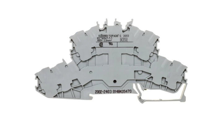 złączka 2-piętrowa 4-przewodowa; złączka przelotowa/przelotowa; L/N; bez podstawki oznacznika; otwory na przewody piętro, nadruk nieb.; na szynę TS 35 x 15 i 35 x 7,5; 2,5 mm²; Push-in CAGE CLAMP®; 2,50 mm²; szary