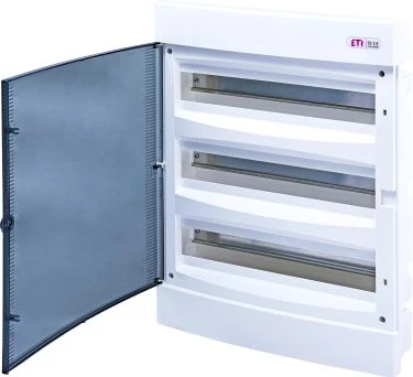 Obudowa podtynkowa 3 rzędy po 18 mod. drzwi transparentne ECM 3X18PT-S o numerze katalogowym 001101097 w kategorii Tworzywowe podtynkowe, Rozdzielnice i obudowy. Produkt wyprodukowany przez markę ETI.