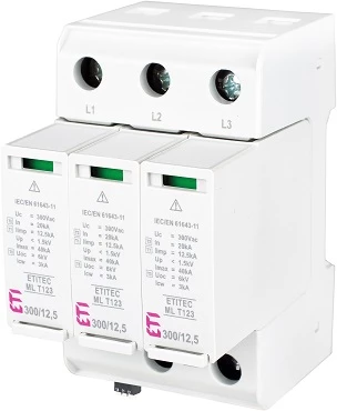 Modułowy ogranicznik przepięć ETITEC ML T123 300/12,5 3+0 o numerze katalogowym 002440665 w kategorii Ograniczniki przepięć - pozostałe, Ograniczniki przepięć. Produkt wyprodukowany przez markę ETI.