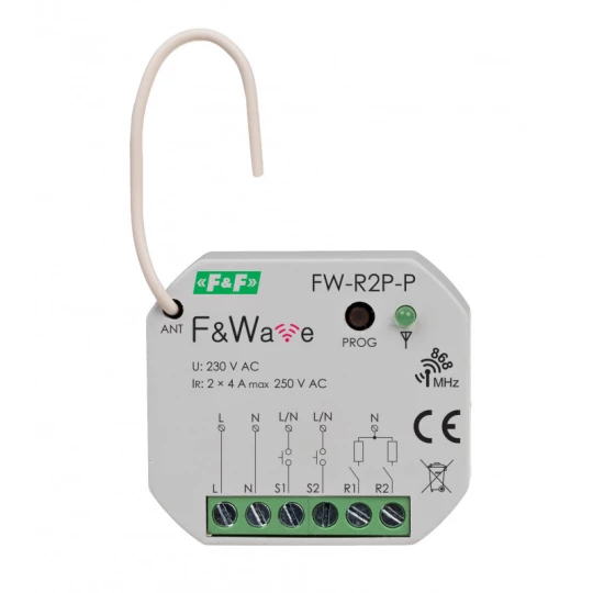 Radiowy podwójny przekaźnik bistabilny do puszki montażowej 60 85÷265v ac/dc, multifunkcyjny, do montażu podtynkowego FW-R2P-P o numerze katalogowym FW-R2P-P w kategorii Przekaźniki - pozostałe, Przekaźniki. Produkt wyprodukowany przez markę F&F.