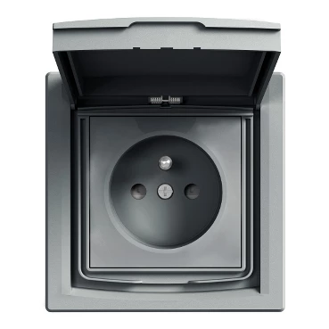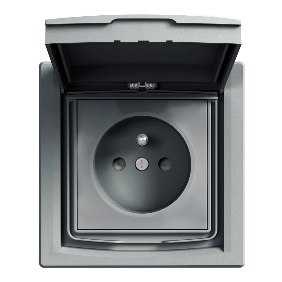 SIMON AKORD SREBRNY GNIAZDO 1X Z/U Z KLAPKĄ DYMNĄ IP44 ZACISKI ŚRUBOWE 16A 250V