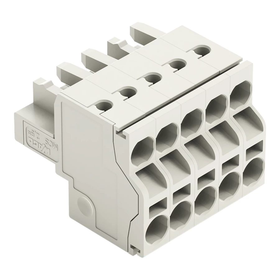 gniazdo 2-przewodowe; Push-in CAGE CLAMP®; 2,5 mm²; raster 5 mm; 5-bieg.; 100% ochrona przed błędnym połączeniem; ze zintegrowaną ścianką końcową; 2,50 mm²; jasnoszary