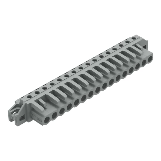 gniazdo THT; konstrukcja kątowa; raster 5 mm; 16-bieg.; kołnierz mocujący; pin lutowniczy 0,6 x 1,0 mm; szary