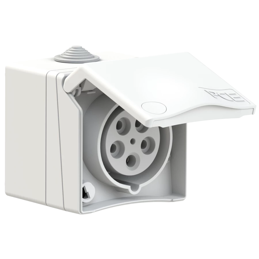 Gniazdo nadtynkowe przelotowe zabudowane seria Design 16A 3P+Z+N 400V IP44 o numerze katalogowym 865-6V w kategorii Gniazda stałe, Gniazda siłowe. Produkt wyprodukowany przez markę PCE, seria DESIGN.