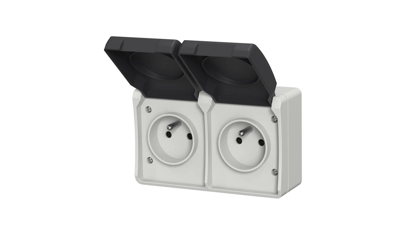 Gniazdo podwójne z uziemieniem natynkowe z klapką Aqua Plus IP54 szare / 40115