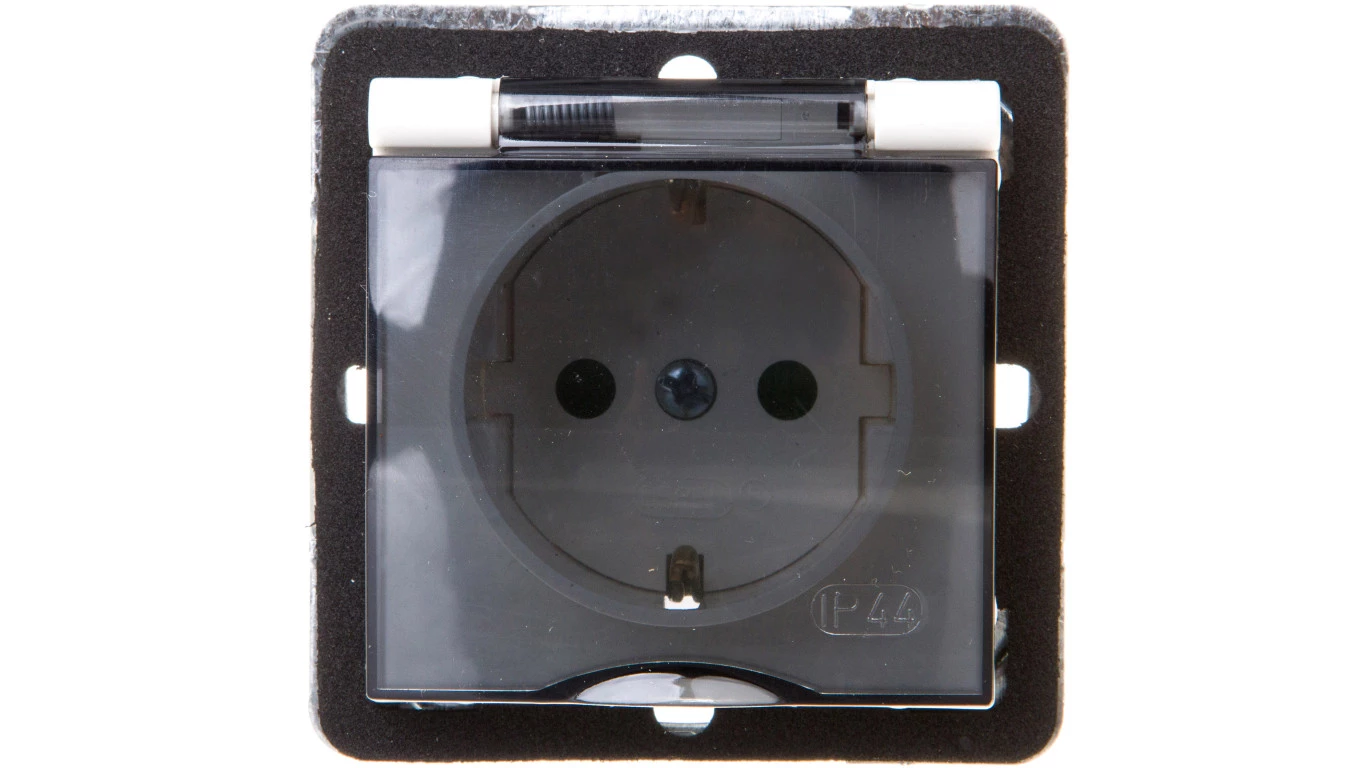 Simon 54 Gniazdo bryzgoszczelne z/u IP44 z klapką transparentną antracyt DGZ1BZ.01/48A