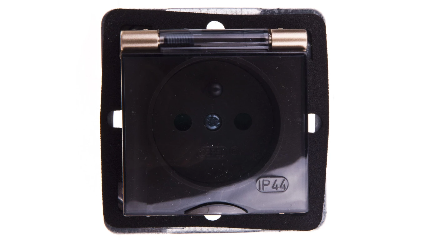 IMPRESJA MODUŁ ZŁOTY METALIK GNIAZDO 1X Z/U Z KLAPKĄ DYMNĄ IP44 Z PRZESŁONAMI ZACISKI ŚRUBOWE 16A