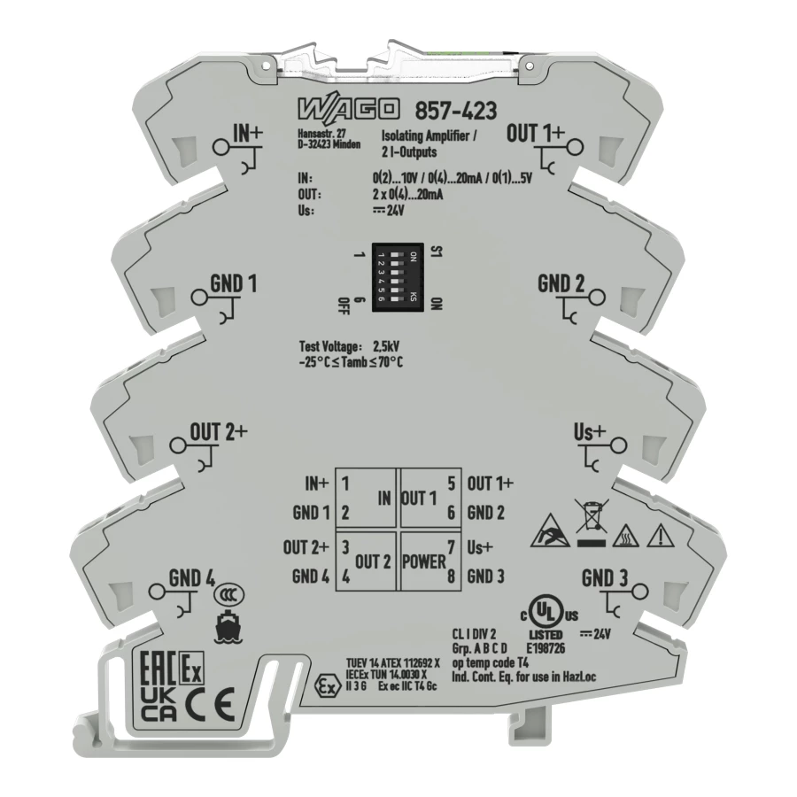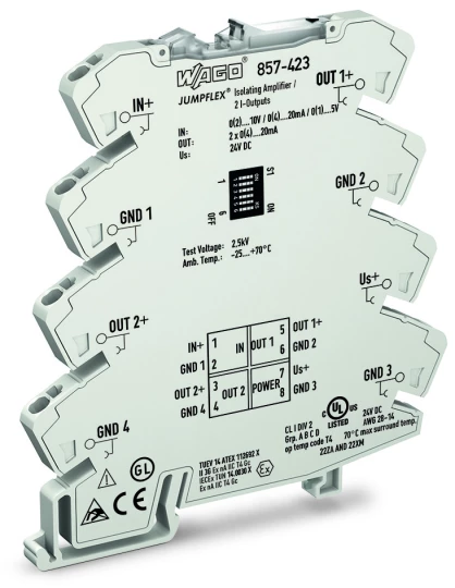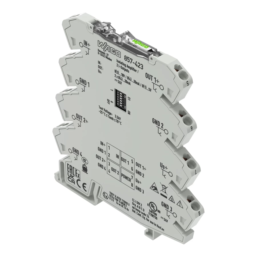 przetwornik separacyjny ze wzmocnieniem; prądowy i napięciowy sygnał wejściowy; 2 x prądowy sygnał wyjściowy; napięcie zasilania 24 V DC; szerokość 6 mm; 2,50 mm²