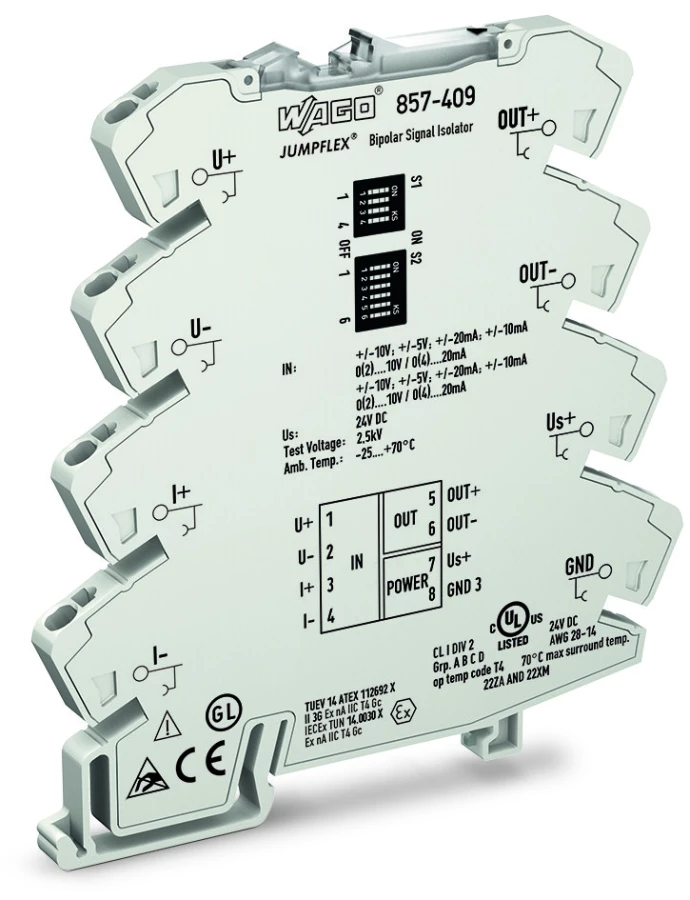 przetwornik separacyjny ze wzmocnieniem; bipolarny prądowy i napięciowy sygnał wejściowy; bipolarny prądowy i napięciowy sygnał wyjściowy; kalibracja zera/zakresu; konfiguracja przy pomocy mikroprzełączników DIP; napięcie zasilania 24 V DC; szerokość 6 mm; 2,50 mm²