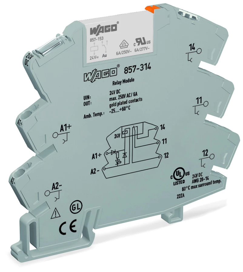 przekaźnik; znamionowe napięcie wejściowe 24 V DC; 1 zestyk przełączny; maksymalny prąd długotrwały 6 A; z pozłacanymi zestykami; sygnalizacja statusu żółta; szerokość 6 mm; 2,50 mm²; szary