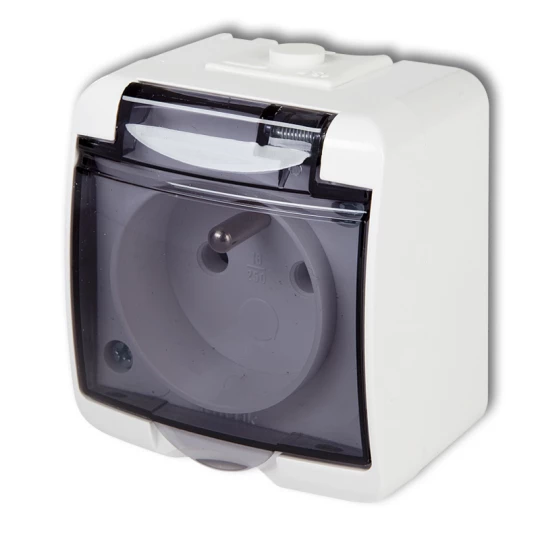 JUNIOR Gniazdo pojedyncze z/u (klapka dymna) biały IP54 GHE-1d