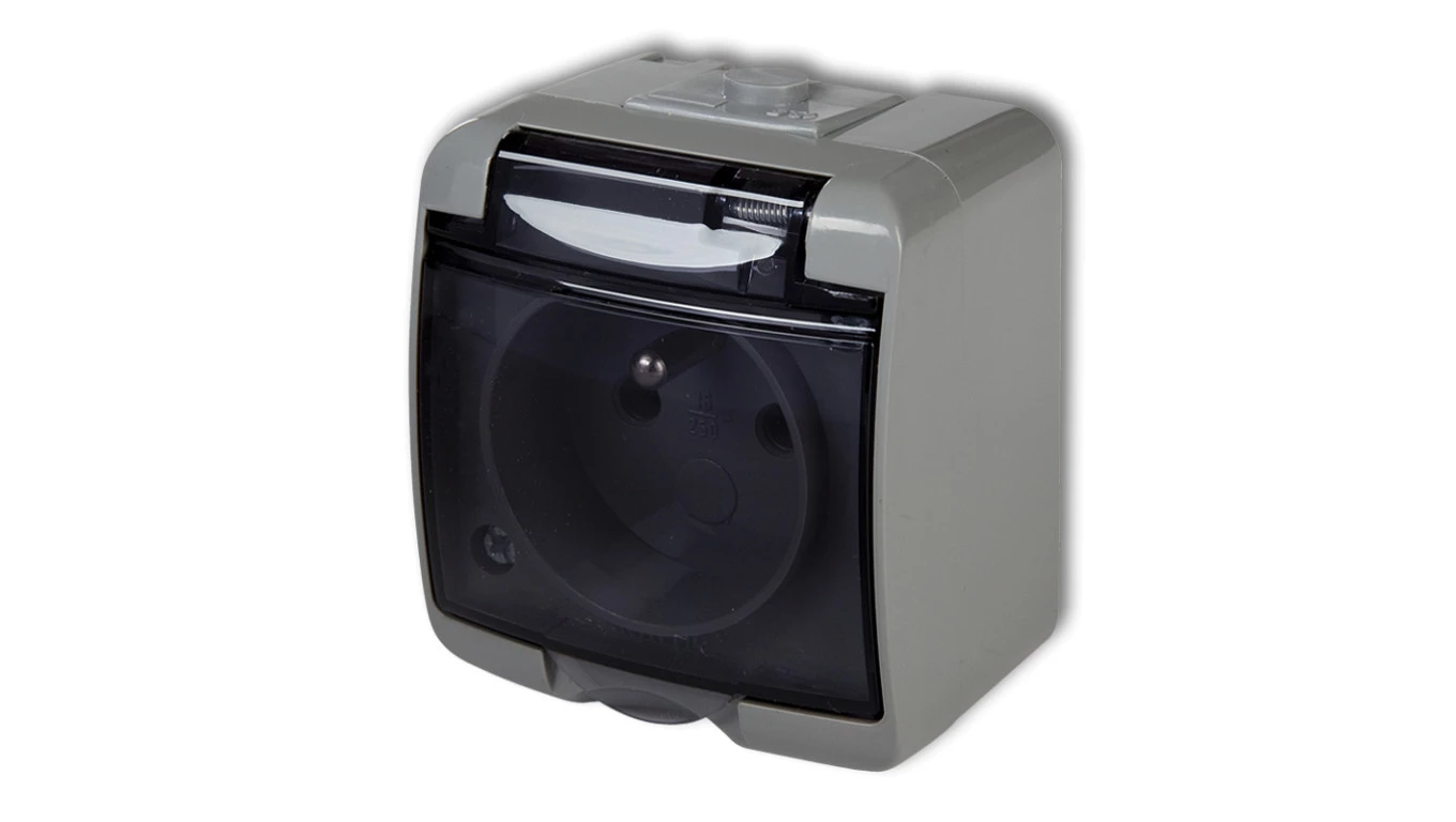 JUNIOR Gniazdo pojedyncze z/u (klapka dymna) popielaty IP54 10GHE-1d