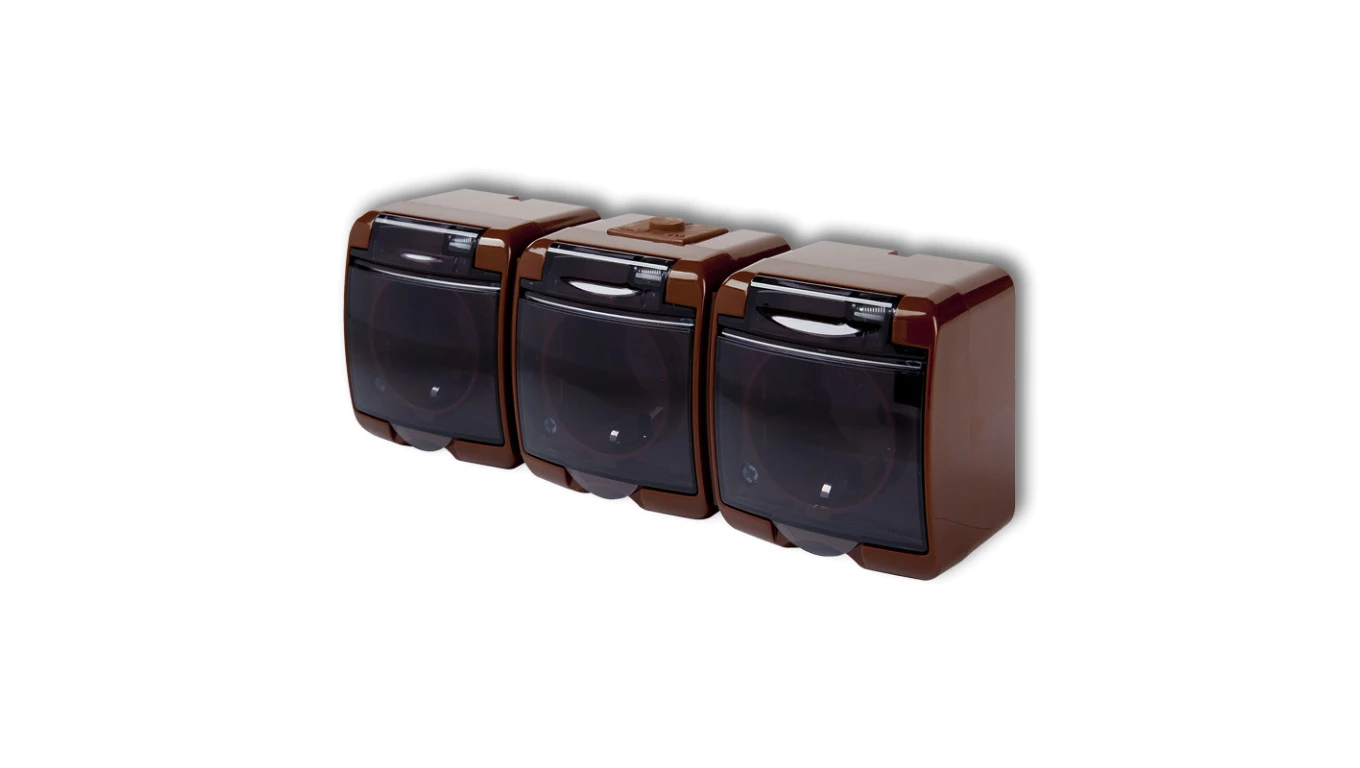 JUNIOR Gniazdo potrójne z/u (klapka dymna) brązowy IP54 4GHE-3d