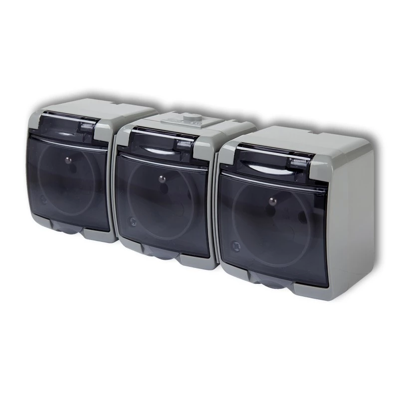 JUNIOR Gniazdo potrójne z/u (klapka dymna) popielaty IP54 10GHE-3d