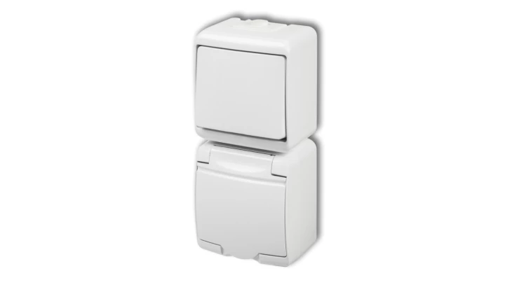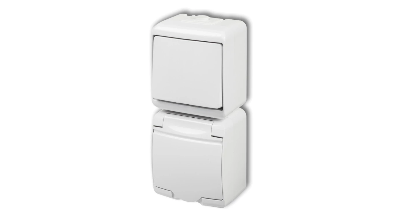 JUNIOR Łącznik jednobiegunowy + gniazdo hermetyczne SCHUKO (klapka w kolorze obudowy) biały WGHP-1s