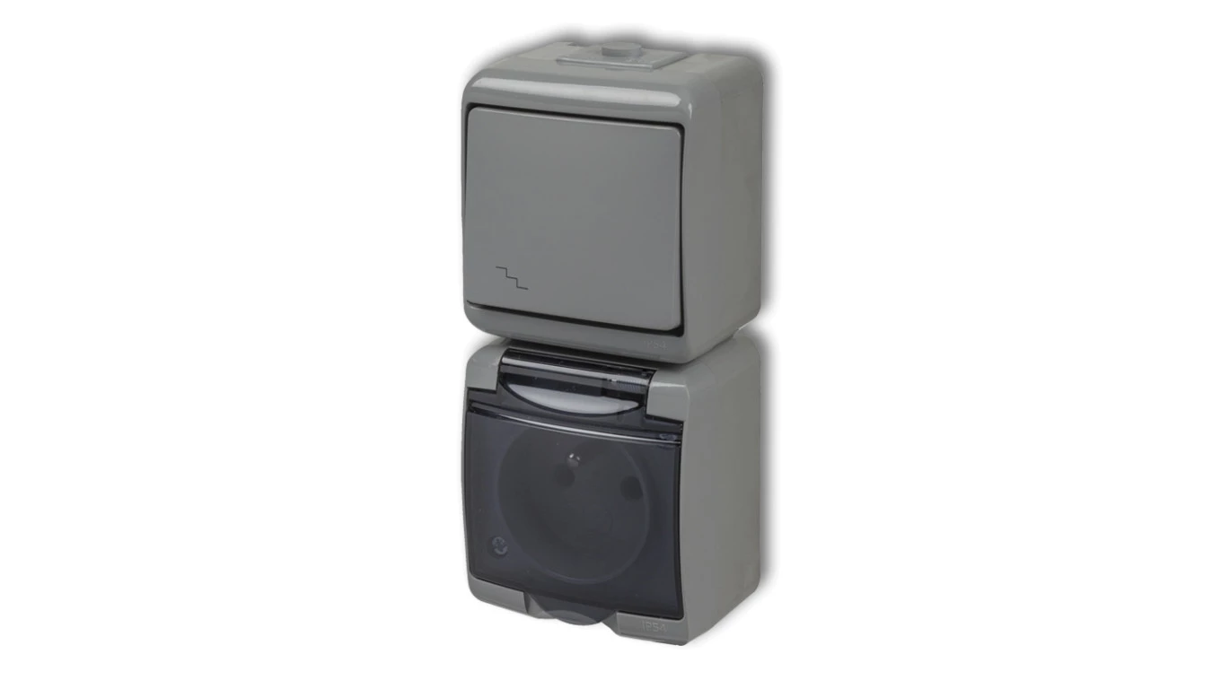 JUNIOR Łącznik schodowy + gniazdo hermetyczne (klapka dymna) popielaty 10WGHP-3d
