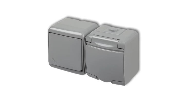 JUNIOR Łącznik schodowy + gniazdo hermetyczne (klapka popielata) popielaty 10WGHH-3p