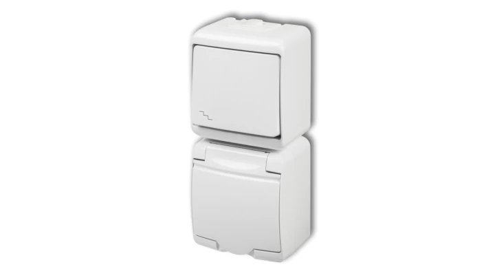 JUNIOR Łącznik schodowy + gniazdo hermetyczne SCHUKO (klapka w kolorze obudowy) biały WGHP-3s
