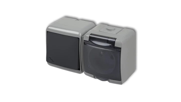 JUNIOR Łącznik schodowy z gniazdem hermetycznym (klapka dymna) popielaty / grafitowy 30WGHH-3d