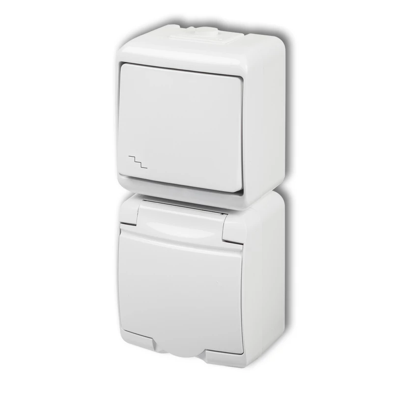 JUNIOR Łącznik schodowy z gniazdem hermetycznym SCHUKO (klapka biała) biały WGHP-3sp