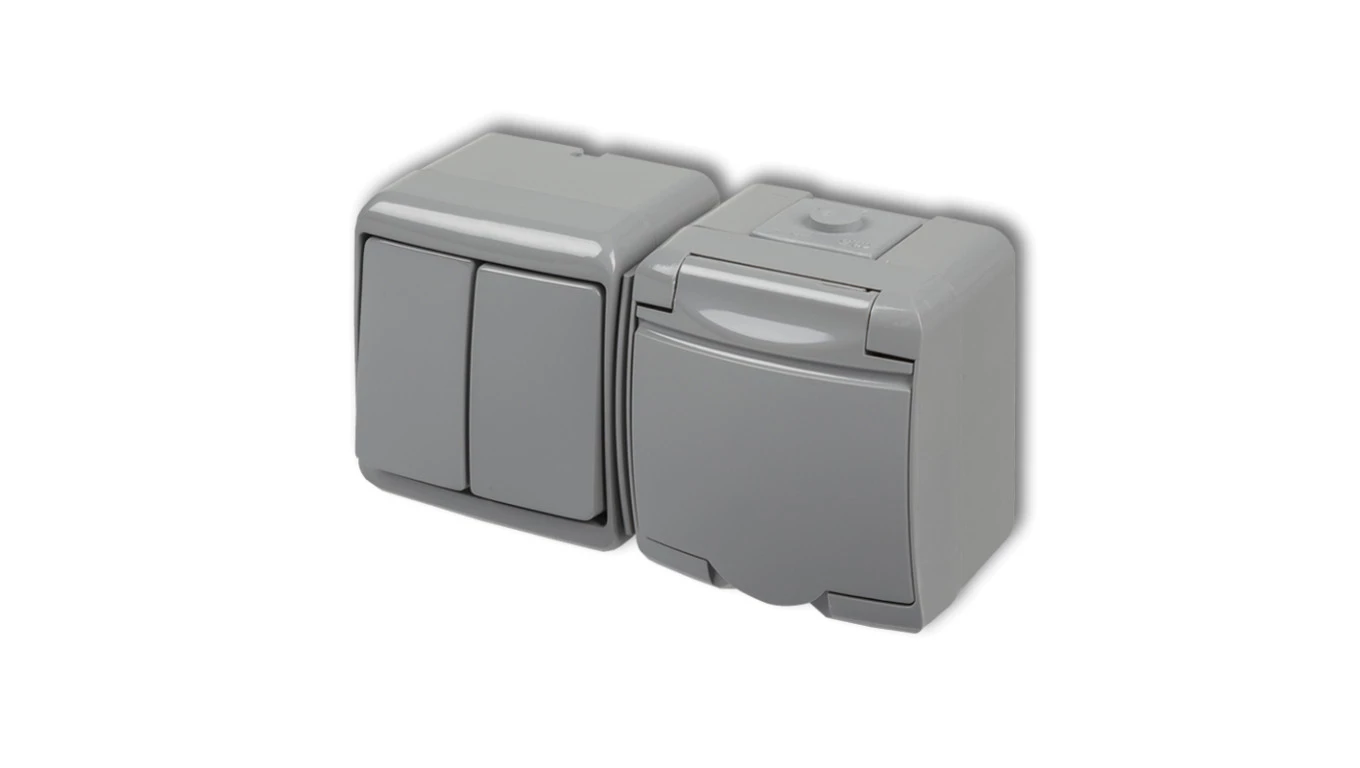 JUNIOR Łącznik świecznikowy + gniazdo hermetyczne (klapka popielata) popielaty 10WGHH-2p