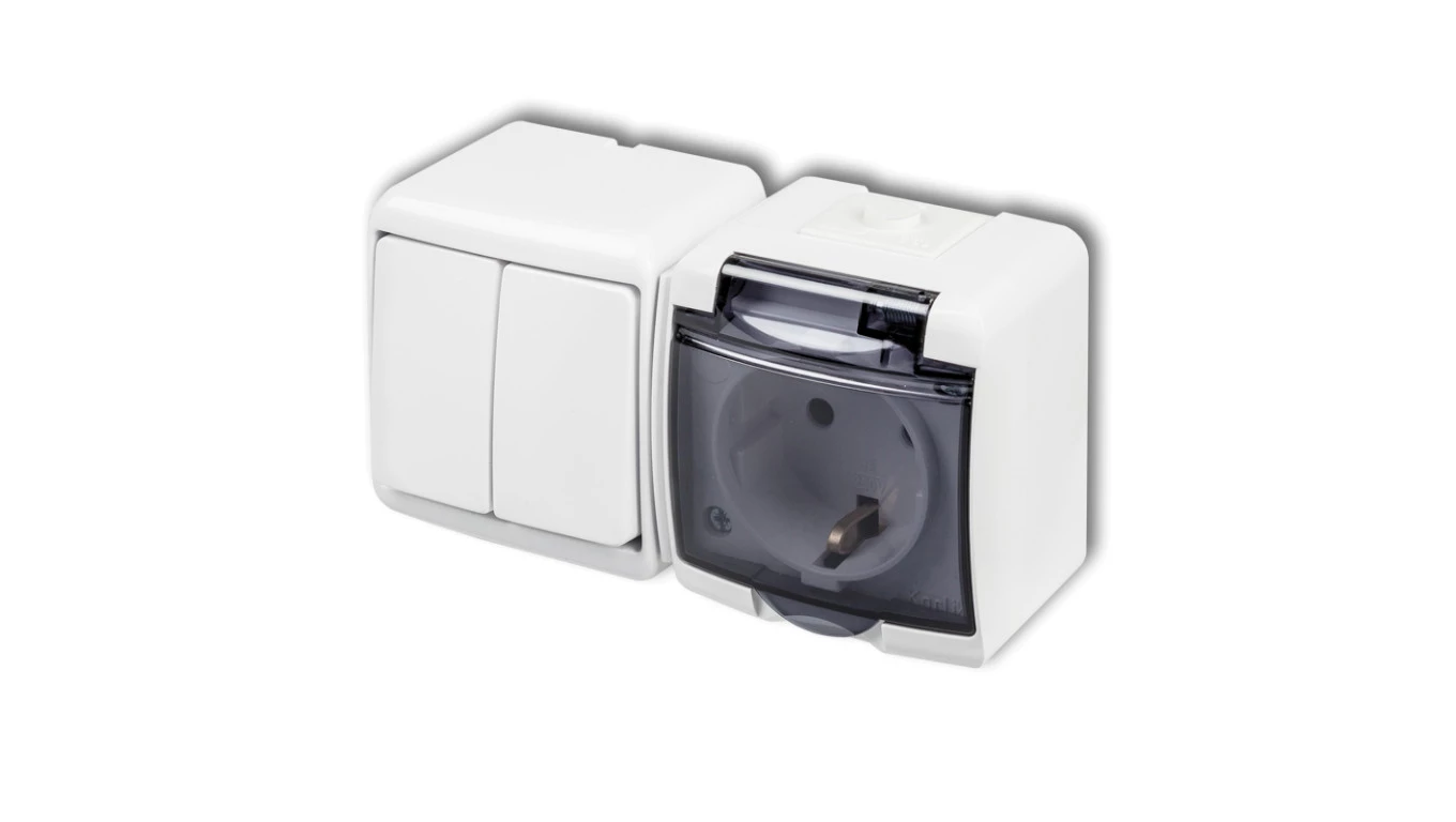 JUNIOR Łącznik świecznikowy z gniazdem hermetycznym SCHUKO (klapka dymna) biały WGHH-2sdp