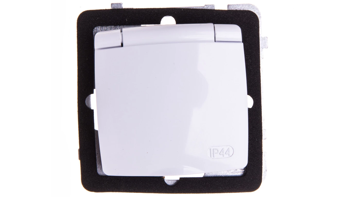 KARO Gniazdo bryzgoszczelne z/u Schuko IP44 z przesłonami klapka biała GPH-1SSP/m/00/w