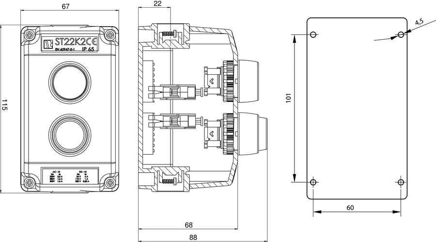 Kaseta sterownicza 3-otworowa z przyciskami zielony/czerwony + lampka sygnalizacyjna IP65 ST22K3\05-1