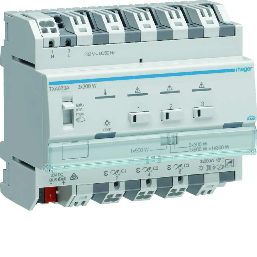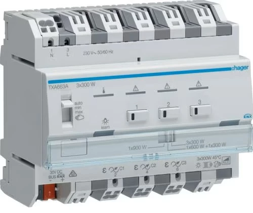 KNX e/s Ściemniacz uniwersalny 3-kanałowy, 3-krotny TXA663A