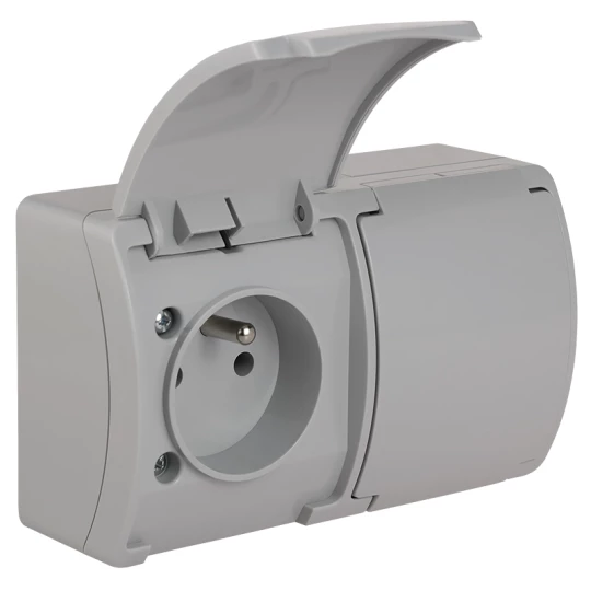 DELFINA SZARY GNIAZDO NT 2X Z/U Z KLAPKĄ IP44 ZACISKI ŚRUBOWE 16A 250V