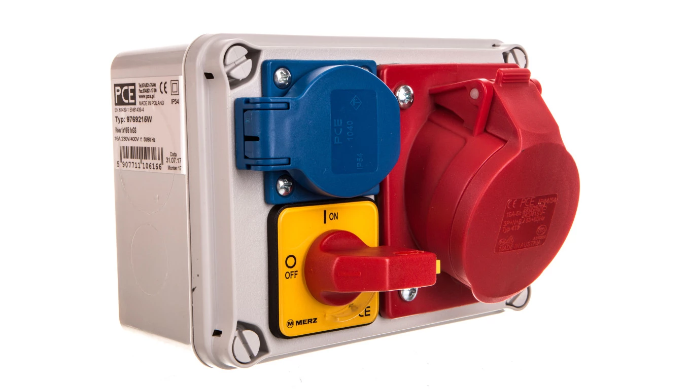 Rozdzielnica stacjonarna z tworzywa typ "Koło" wejście M20 wyjście 16/5 GS + wyłącznik 16A 0-1 IP44 o numerze katalogowym 9769215W w kategorii Zestawy zasilające, Osprzęt przemysłowy-siłowy. Produkt wyprodukowany przez markę PCE, seria KOŁO.